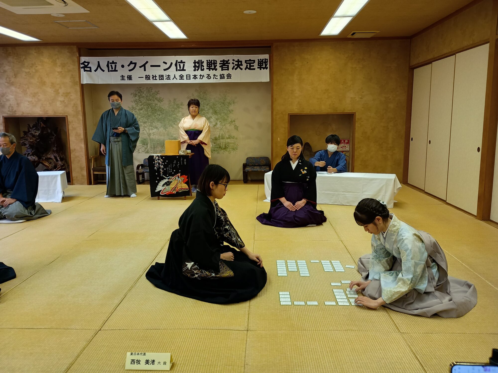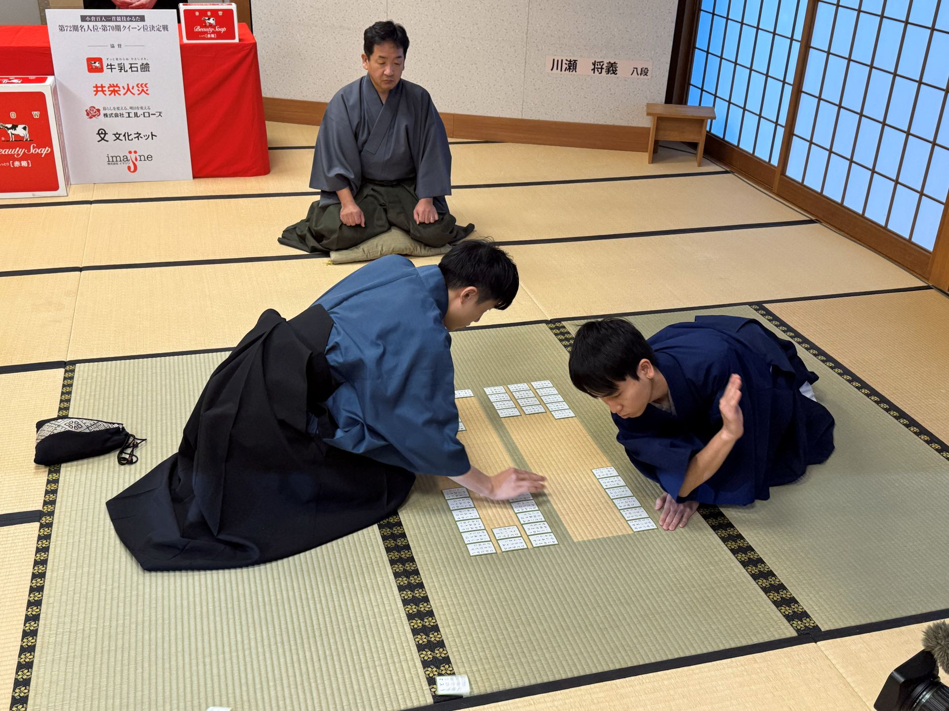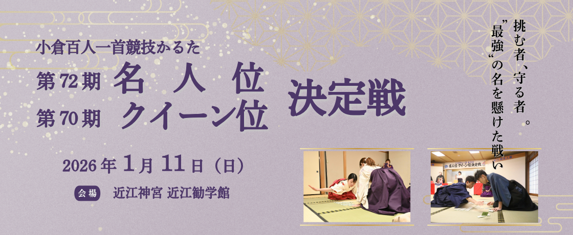 ランダムに変わる取り札を見て上の句を当てる練習ができます。毎日の腕試しにご活用ください。