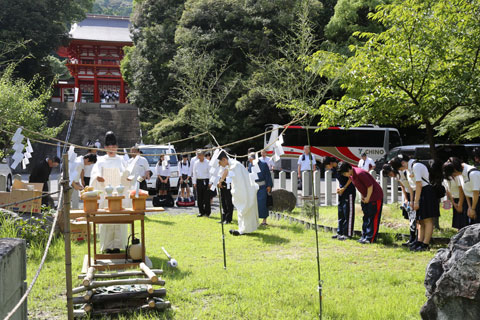 全国高校かるた選手権大会の折には、「小倉百人一首かるた供養祭」を近江神宮境内でおこなっています。永年親しみ思い出も多い、古くなったかるた札に感謝を捧げ、今後の上達を祈願してのお焚き上げ~焼納式~をしています。